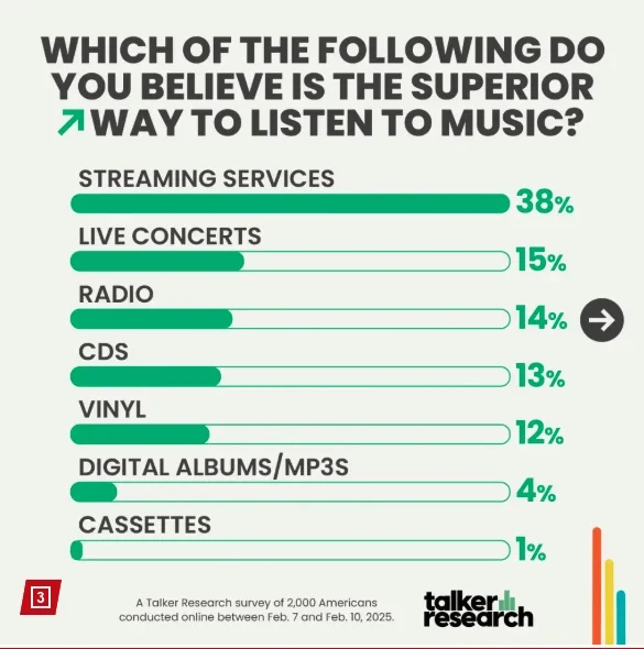 Americans think that streaming is the best way to listen to music, followed by live concerts. (Talker)