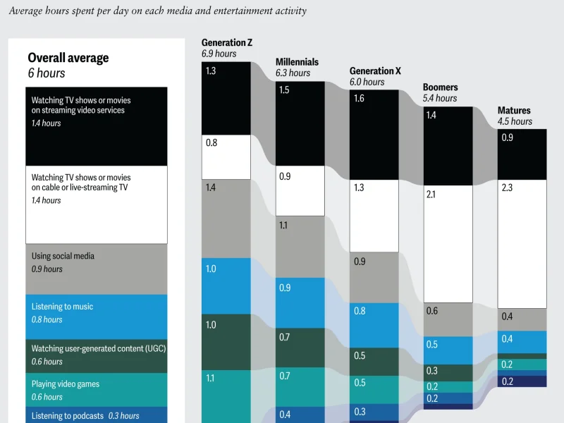 US audiences spend about 6 hours with media and entertainment content daily, with social media becoming a dominant force among younger generations. (Deloitte)