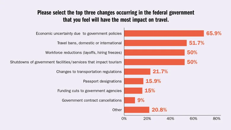 When asked which factor would most impact travel in the near future, 66% of US travel advisors said economic uncertainty due to government policies is the top concern. (Travel Weekly)