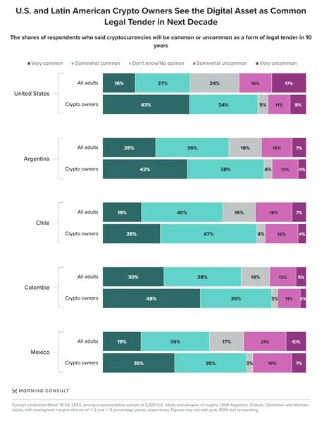 While a majority of adults in the four Latin American countries surveyed think crypto will be at least somewhat common as legal tender in the next 10 years, fewer than half of Americans feel the same (43%). (Morning Consult)