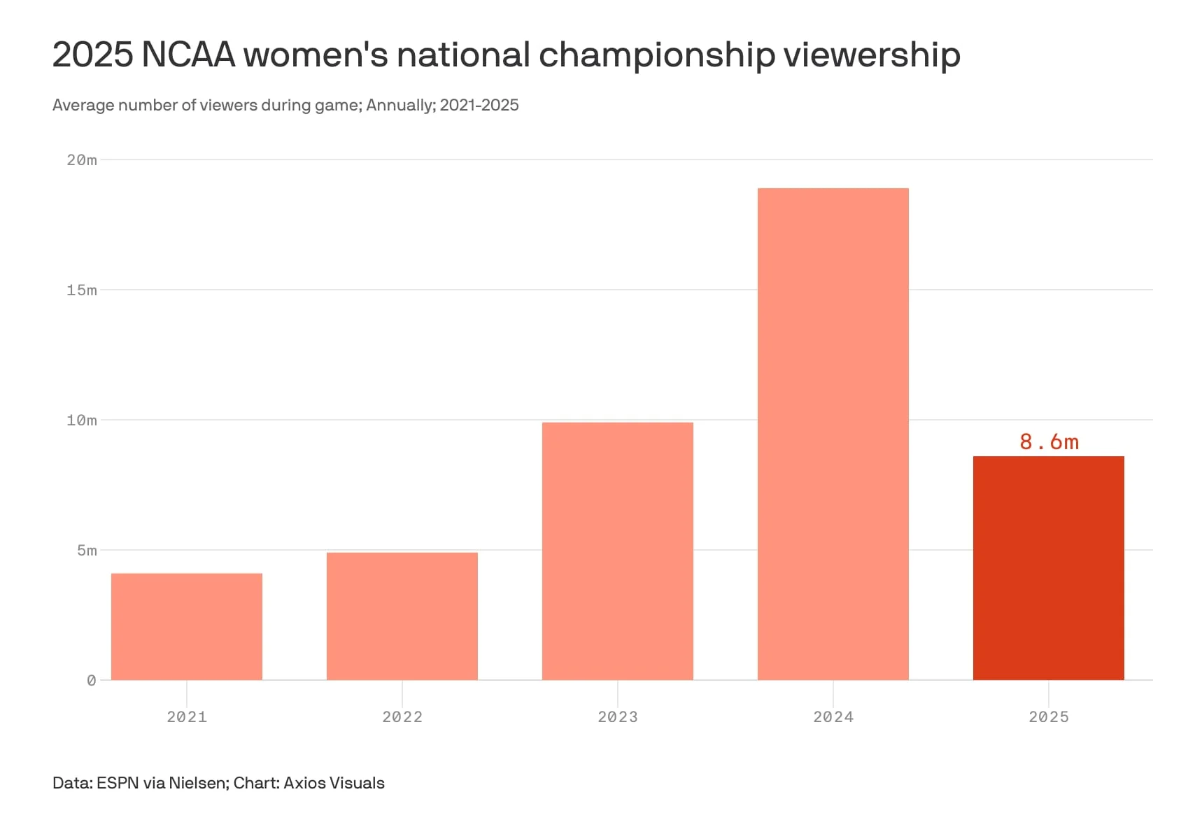 Viewership of the US Women's National Championship basketball game was down from last year's matchup (18.9M) featuring Caitlin Clark, but it still became the third most-watched. (Axios)