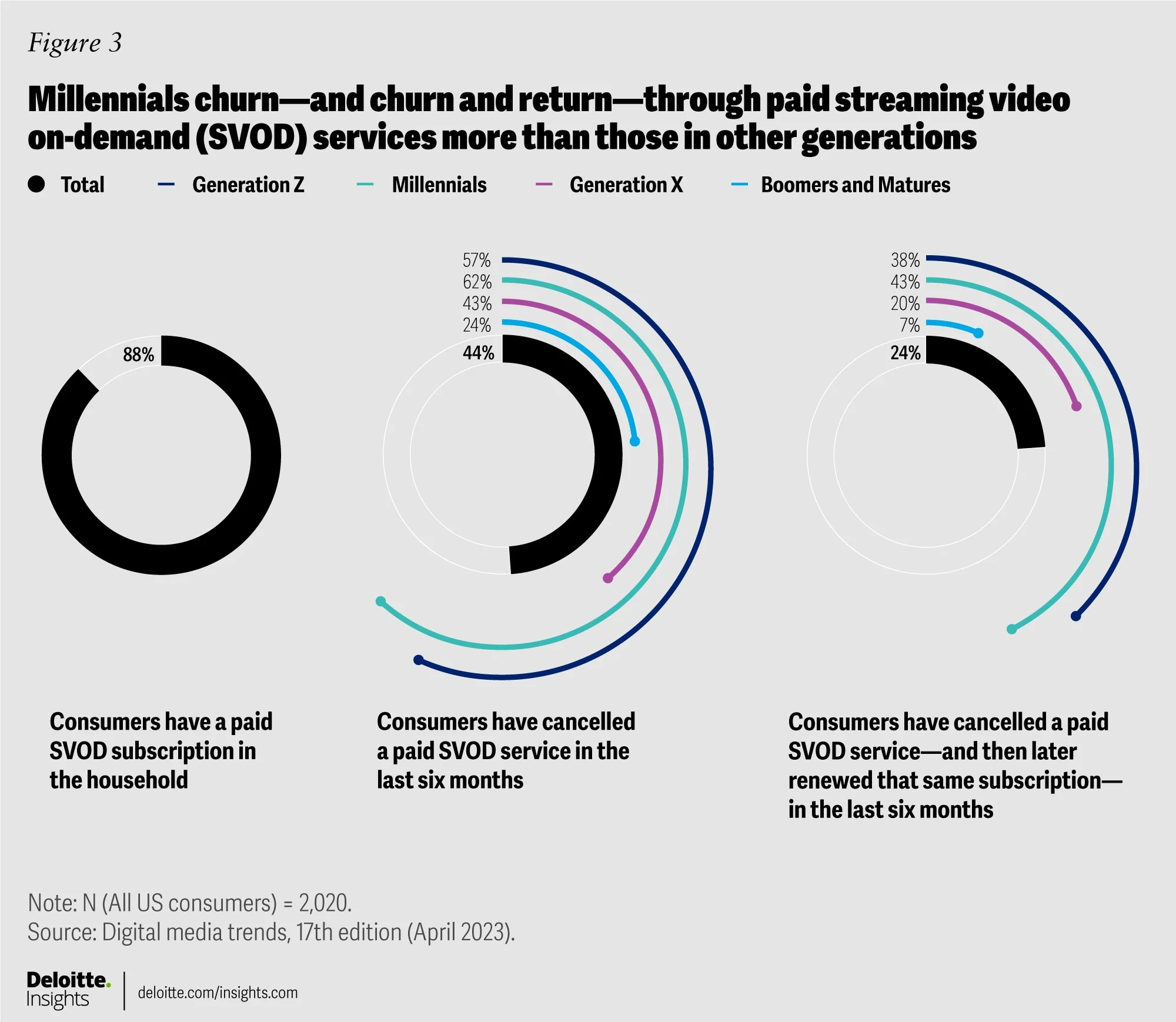 Nearly two-thirds of US Millennial and Gen Z consumers have canceled a streaming subscription in the past six months. (Deloitte)