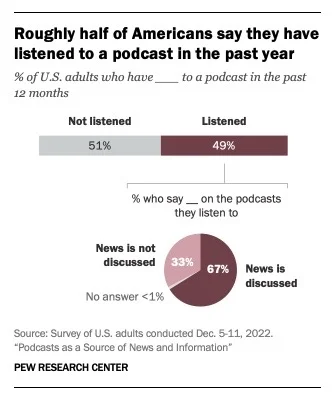 Roughly half of US adults have listened to a podcast in the past year, including one-in-five who listen to podcasts at least a few times a week. (Pew)
