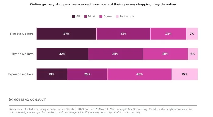 US remote workers are nearly twice as likely as office workers to order groceries online. (Morning Consult)