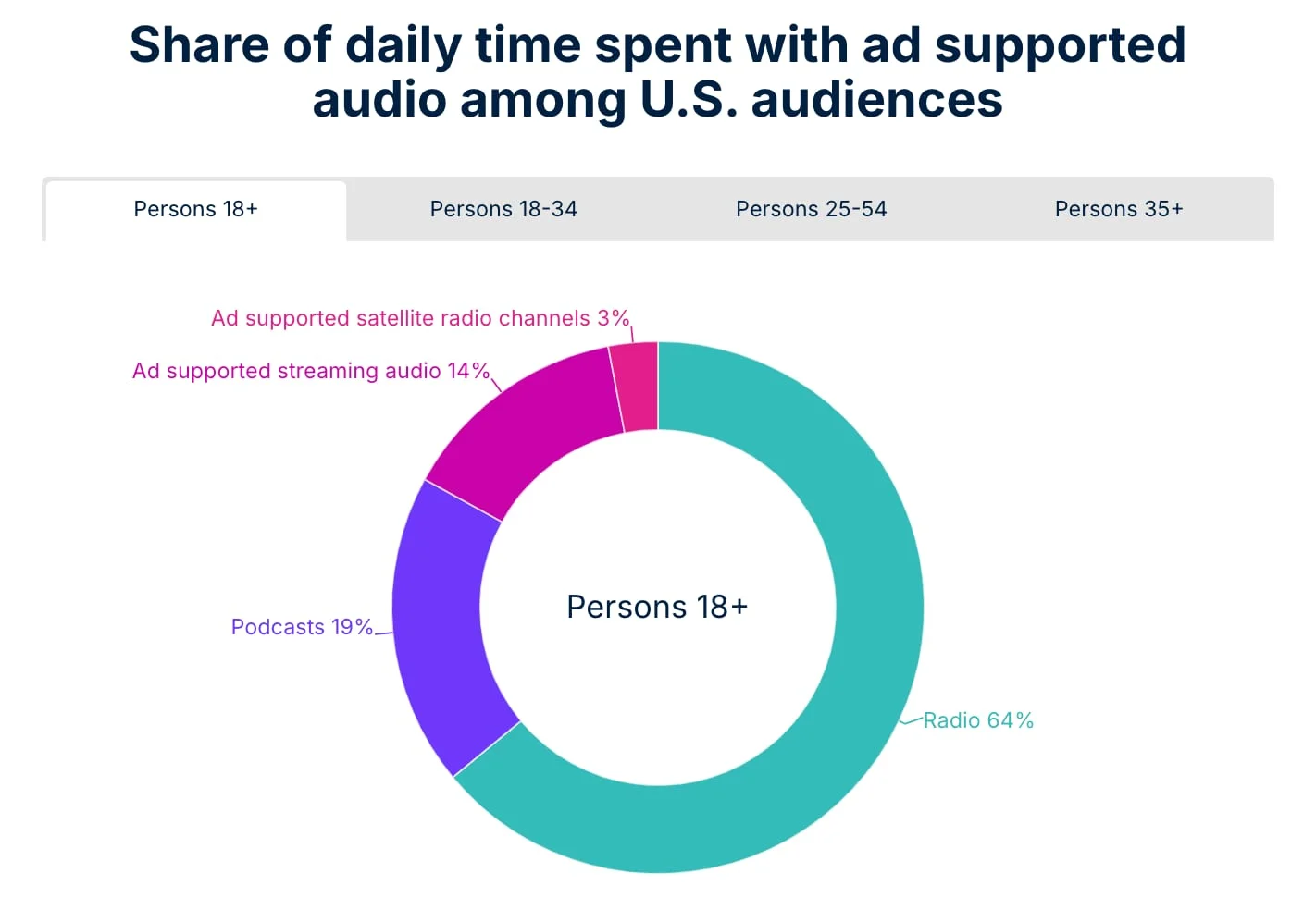 Daily audio consumption among US adults amounted to 3 hours and 50 minutes this quarter, with 64% of that time belonging to radio. (Nielsen)