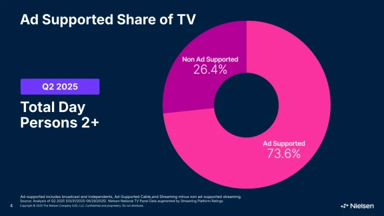 Ad-supported content across TV and streaming platforms accounted for almost 74% of US TV viewing in the first six months of 2025. (Nielsen)