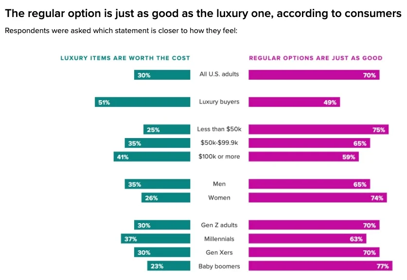 A recent survey found that 70% of U.S. adults believe regular options are just as good as luxury ones, with quality being the primary attribute that defines luxury across travel, food and retail products. (Morning Consult)