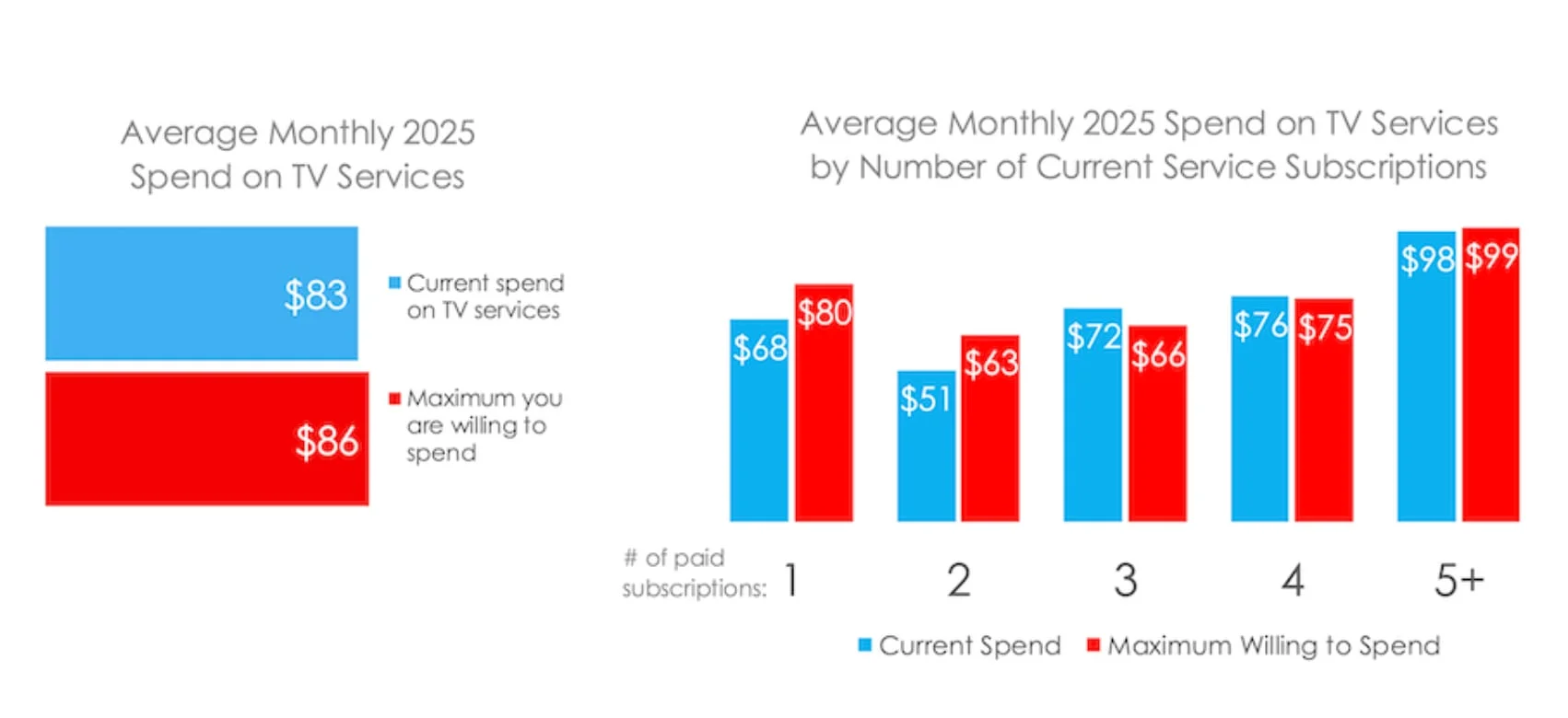 The average US streaming service user spends $83 per month on TV services, and says they are only willing to spend a few dollars more ($86). (Media Play News)