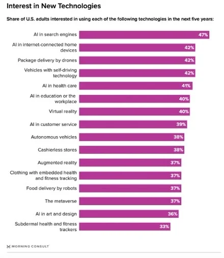 Roughly half of Americans (47%) are interested in trying AI in search engines in the next five years, ahead of other forward-looking technologies. (Morning Consult)
