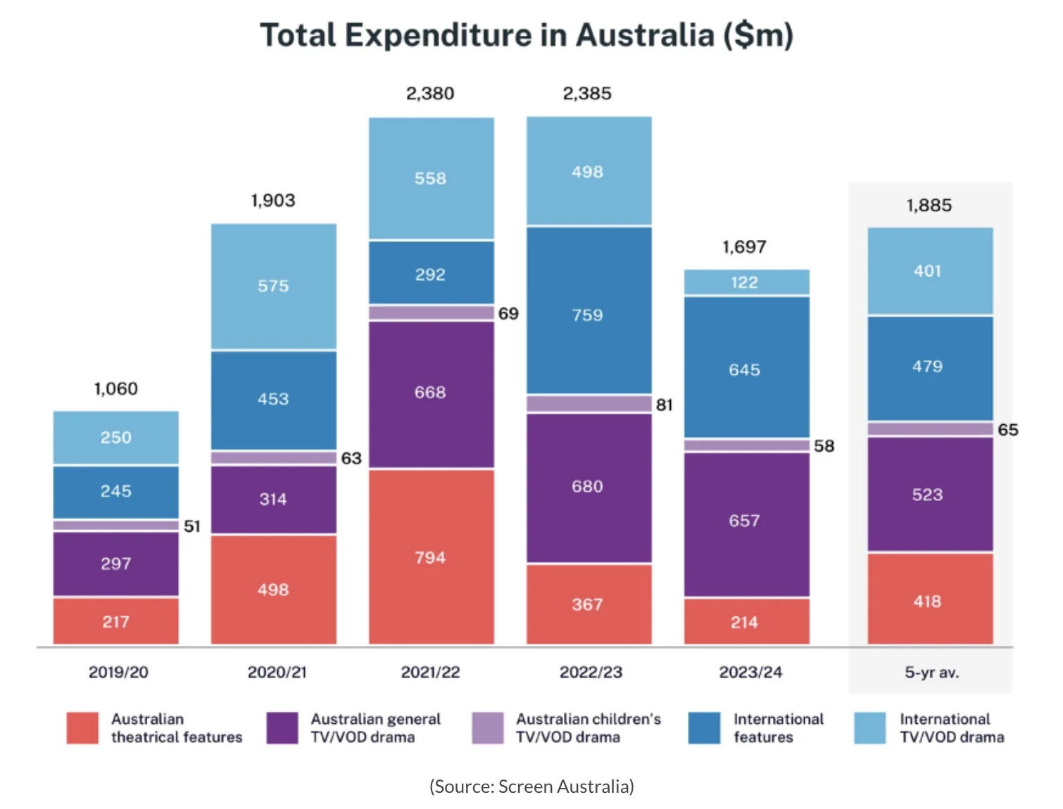 Australian drama production spending fell by nearly 30% to $1.7B in 2023/24, primarily due to reduced high-budget international TV and theatrical productions, while streaming video on demand (SVOD) spending grew by 17%. (If.com)