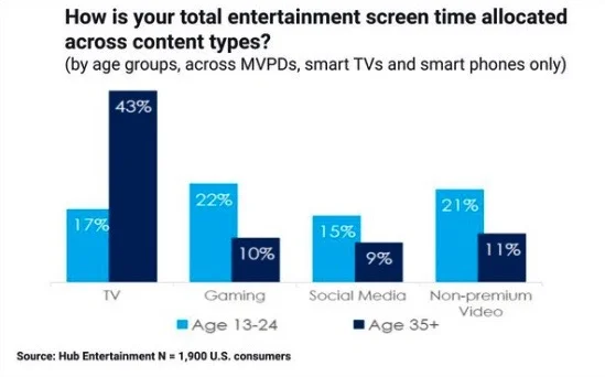 Americans over 35 spend more than double the time on TV shows that Gen Z does. Gen Z spends more time on gaming (22%) and non-premium videos on platforms like TikTok and YouTube (21%) than they do watching traditional TV (17%) or video-on-demand movies (14%). (Media Post)
