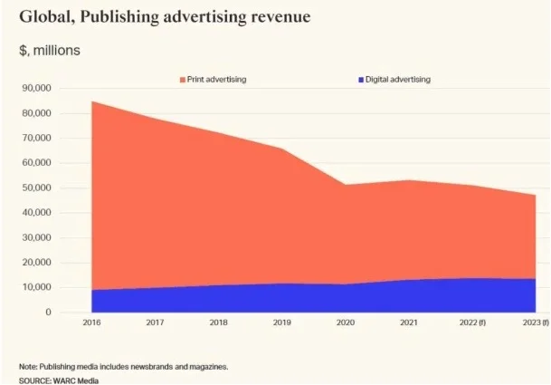 Global advertising revenue for publishers is forecast to decline by 7.7% this year to $47.2B as publishers compete with the likes of Amazon, which alone made $37.7B in advertising services in 2022. (Press Gazette)
