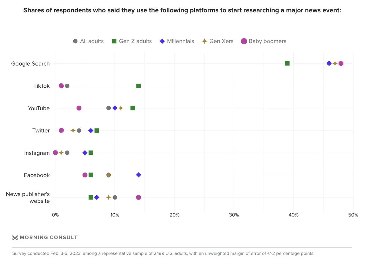 14% of US Gen Z adults say TikTok is where they start researching major news events, while 13% leverage YouTube. (Morning Consult)