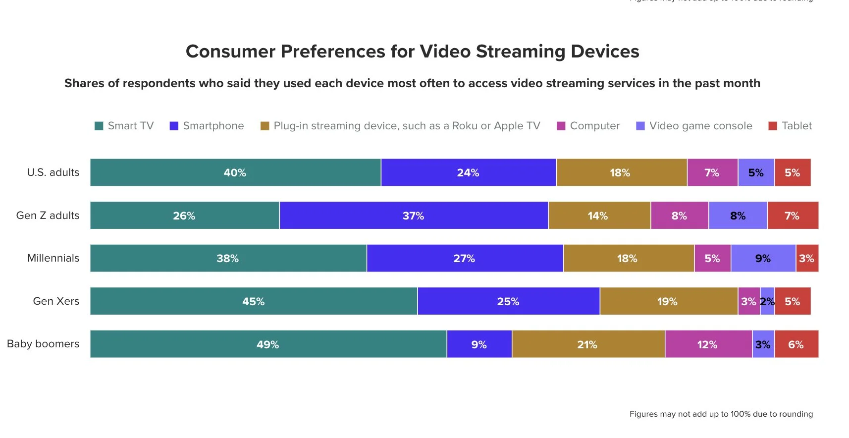 The share of US Gen Z adults who said smartphones were their preferred device for video streaming was 13 points higher than the share of all Americans overall who said the same. (Morning Consult)