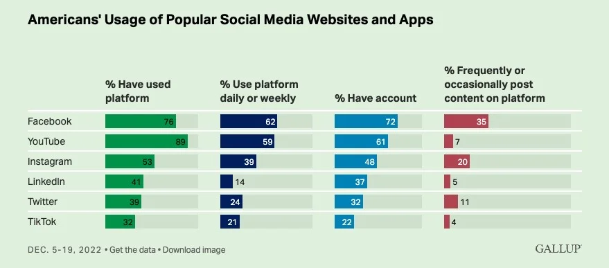 US adults are more inclined to browse content on social media than to post their own content to them. The vast majority of those who say they use these platforms have accounts with them, but less than half who have accounts, and even smaller proportions of all US adults, post their own content. (Gallup)