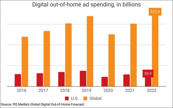After plummeting 39% in the US and 26% worldwide in 2020, digital out-of-home expanded in both 2021 and 2022 in the US and worldwide, respectively, reaching $3.9B in the US and $12.3B worldwide in 2022. (Media Post)