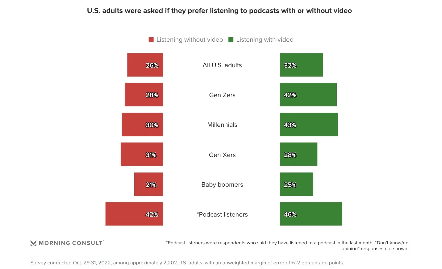 Almost half (46%) of US podcast listeners prefer consuming them with video, compared with 42% who would rather listen without video. Additionally, 15% of podcast listeners would pay between $10 and $25 to attend a live recorded event, while 46% wouldn’t pay to see a live podcast recording. (Morning Consult)