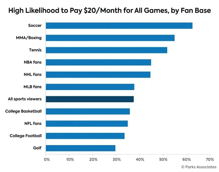 Over 60% of soccer fans are highly likely to pay more than $20 per month for all games, the highest of any sport. MMA/Boxing and Tennis fans follow closely behind. (World Soccer Talk)