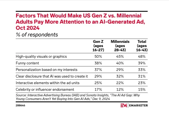 High-quality visuals are the most important factor in AI-generated ads for young audiences, with 50% of Gen Z and 45% of millennials paying attention to visual quality, while celebrity endorsements are least effective. (Emarketer)
