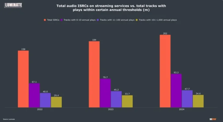 Over 200M tracks are now available on streaming services, but nearly half are played fewer than 10 times annually, highlighting the challenge of music oversaturation on digital platforms. (Music Business Worldwide)