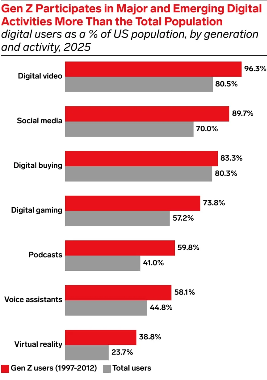 96.3% of US Gen Zers are digital video viewers, compared to 80.5% of the overall US population. (Emarketer)