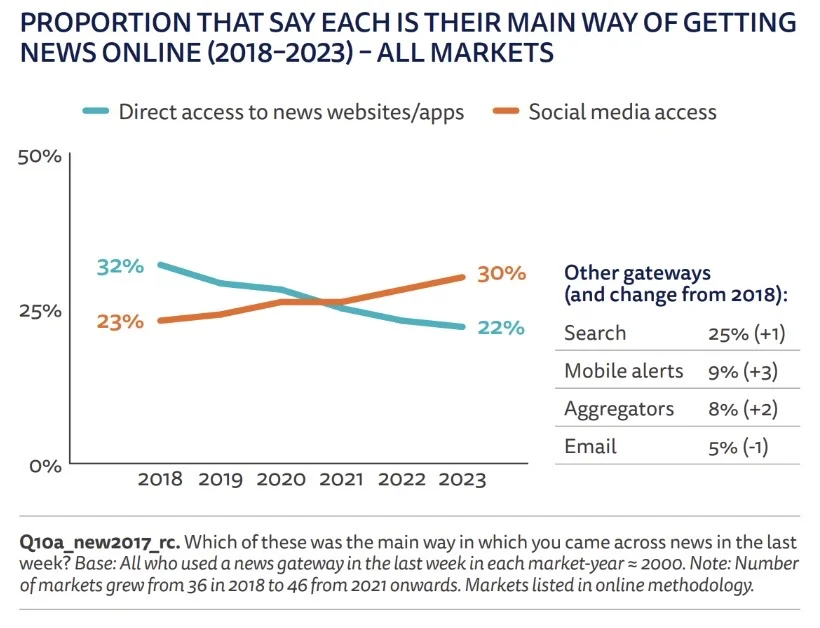 Most consumers globally prefer to access news via social media, search, or mobile aggregators, with only 22% preferring to start their news journeys with a website or app. (Reuters)