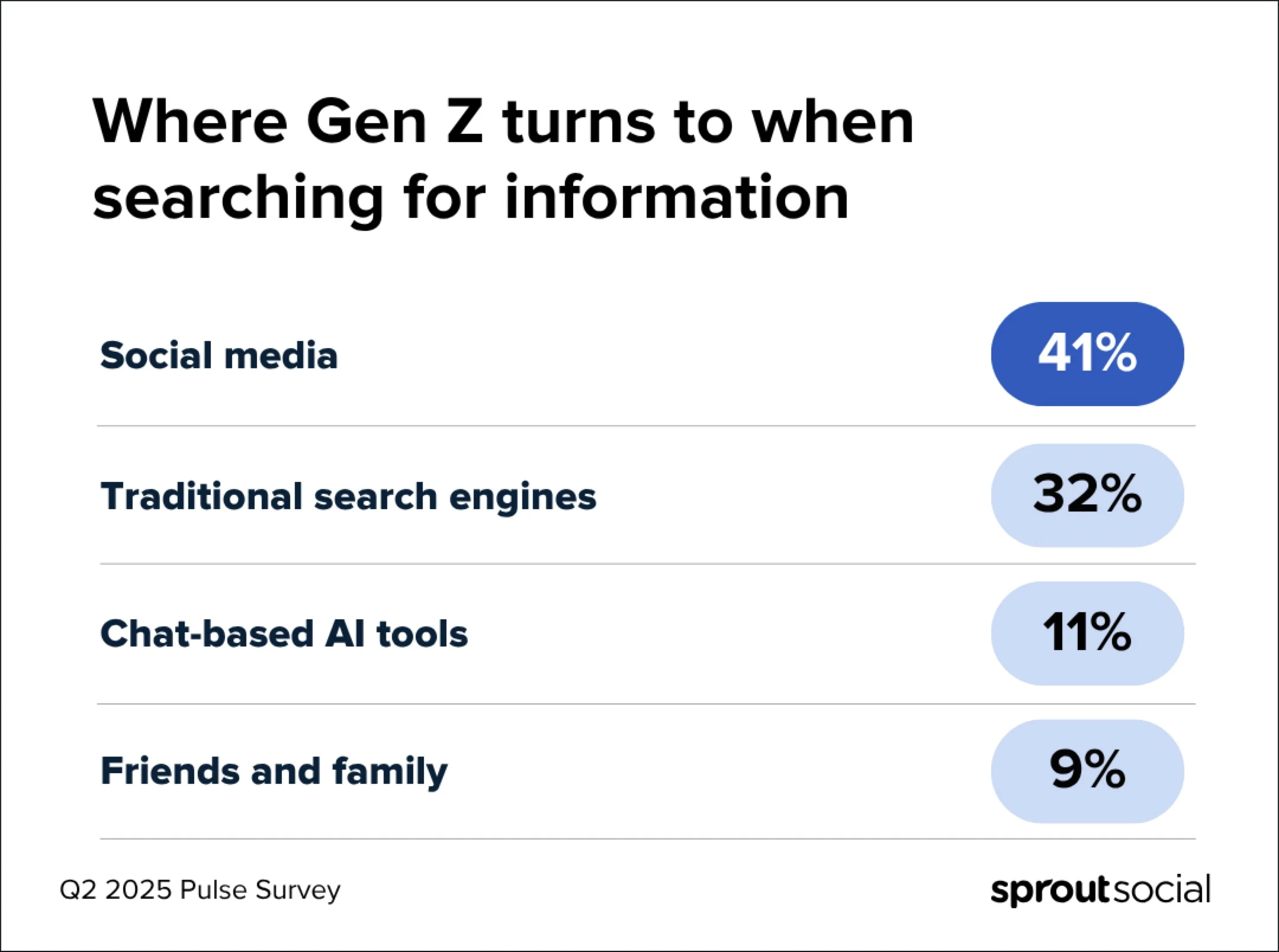 41% of global Gen Z consumers use social media as their first source when looking for information, 32% turn to traditional search engines, and 11% use chat-based AI. (Marketing Dive)