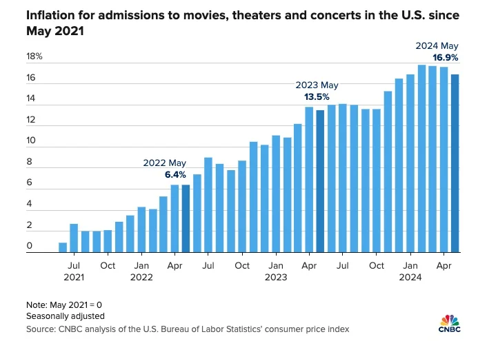 The cost of admissions to movies, theaters and concerts in the US has grown by almost 17% since May 2021. (CNBC)