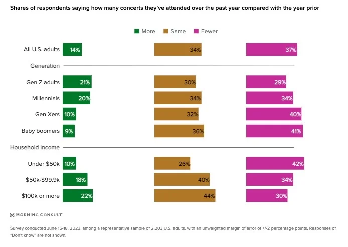 Over a third of US adults (37%) have attended fewer concerts in the past year, and 39% of those who expect to attend fewer concerts in the next year are interested in virtual performances. (Morning Consult)