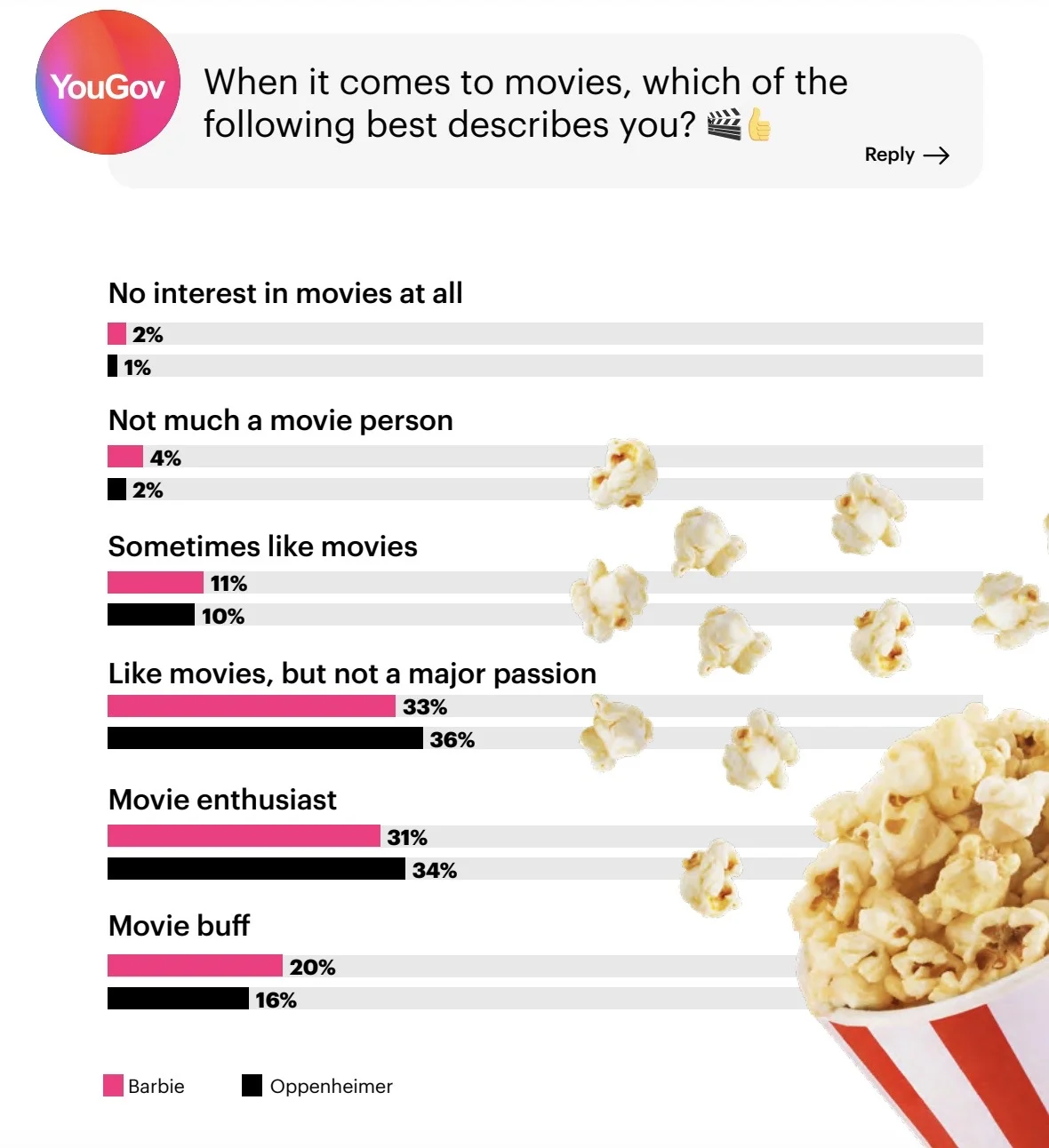 About half of US adults planning to see "Barbie" or "Oppenheimer" consider themselves movie enthusiasts or movie buffs. (YouGov)
