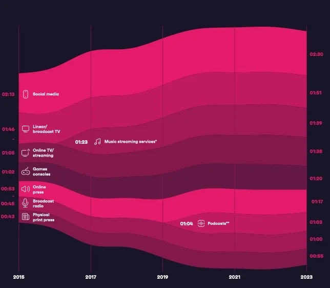 As of Q1 2023, millennials worldwide spend 2h30m on social media daily - 39 minutes more than broadcast TV, the next highest media channel. (GWI)