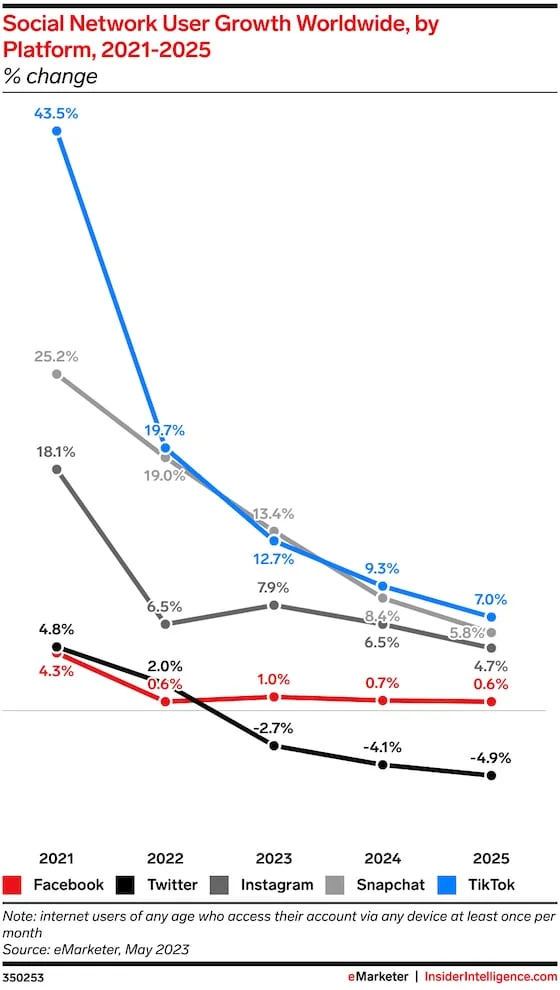 Snapchat will overtake TikTok as the fastest-growing social platform by users in 2023 with 13.4% YoY growth. (Insider)