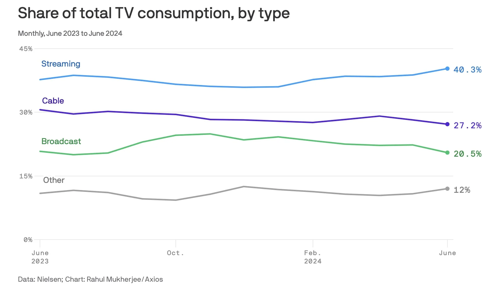 Americans spent 40.3% of their TV viewing time in June on streaming services, a record high. (Axios)