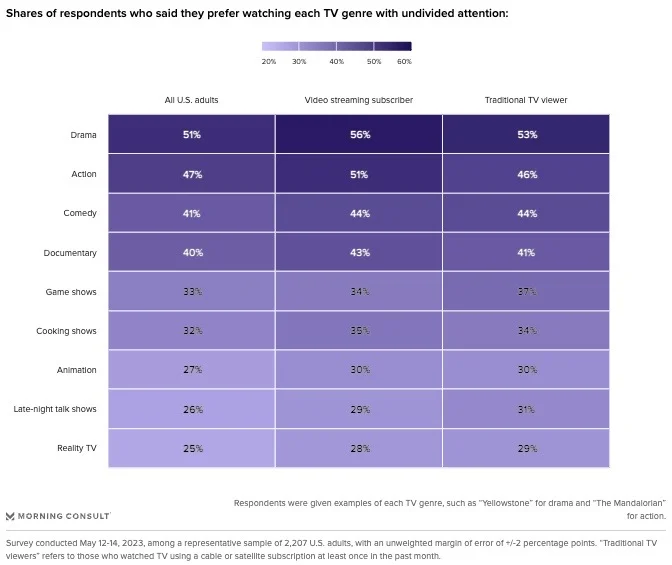 Americans pay more attention to scripted shows than unscripted content, with just a quarter preferring to watch reality TV with undivided attention. (Morning Consult)