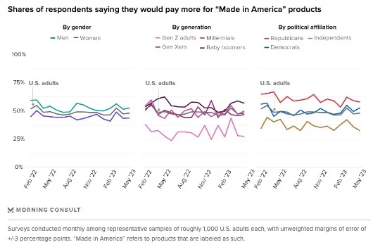 US consumer demand for “Made in America” goods has remained strong since early 2022 despite persistently elevated inflation, rising interest rates and recent banking sector instability. (Morning Consult)
