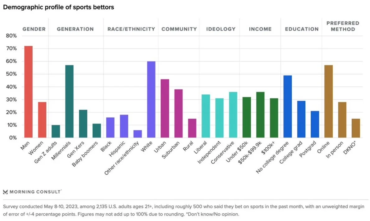 Nearly 3 in 4 (72%) of US adults who bet on sports in the past month are men, and millennials are overrepresented as well. (Morning Consult)