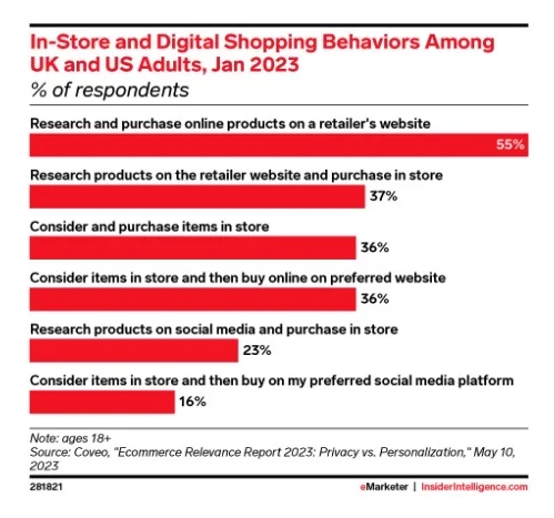 Over half of US and UK adults research and buy products online via a retailer’s website. 37% take a slightly different approach, researching products on a retailer’s website but waiting to buy them in a physical store. (eMarketer)