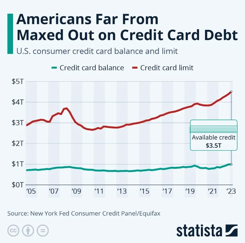 With a total credit card balance of $986B and a total limit of $4.5T, US consumers have $3.5T in untapped available credit on their cards. (Statista)