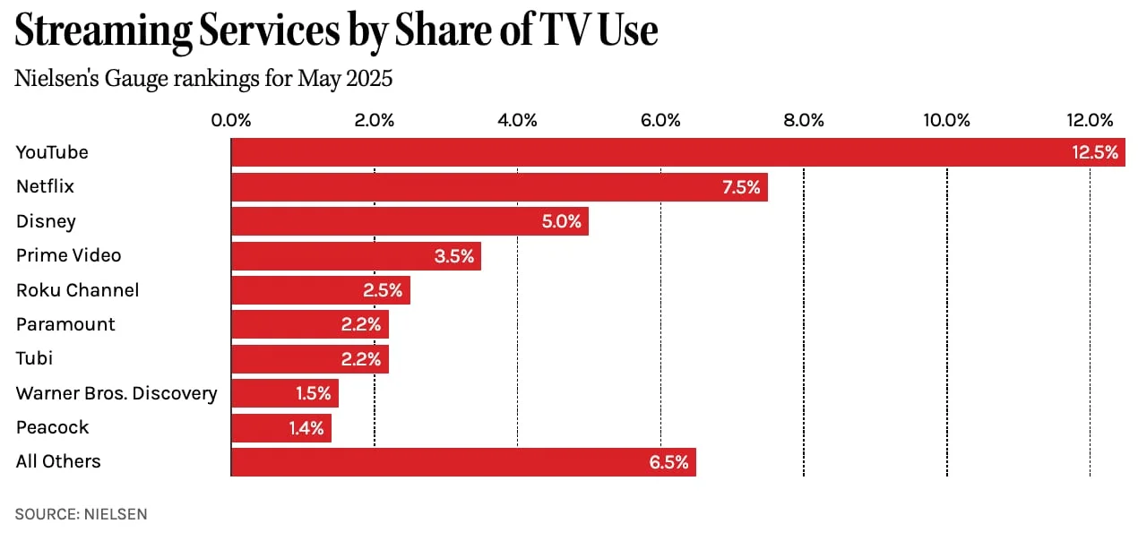YouTube and Netflix, the two biggest streamers, accounted for 20% of all US TV use in May, nearly beating the broadcast total by themselves. (THR)