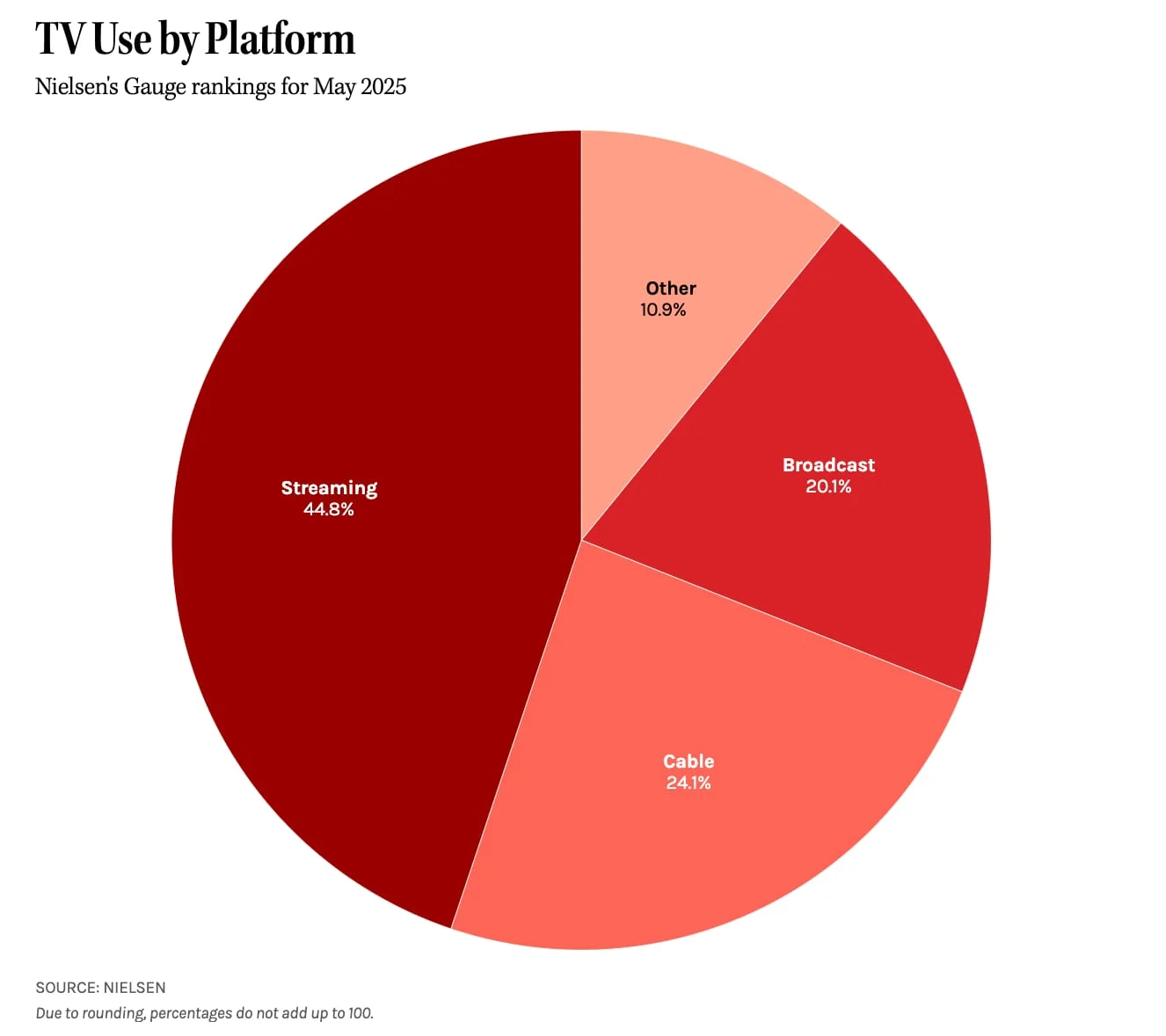 Streaming captured 44.8% of viewing time in the US for May, beating the combined tally of 44.2% for cable and broadcast. (THR)