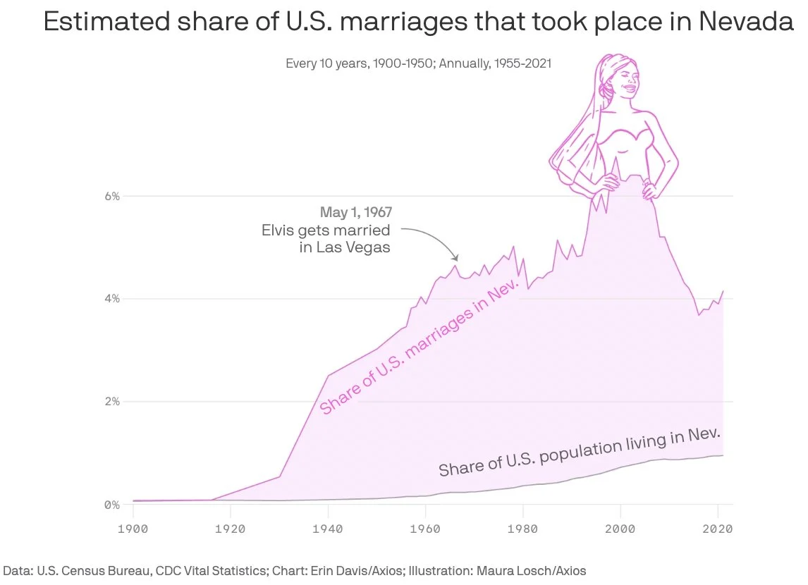 Americans still love to tie the knot in Las Vegas. Roughly 4% of US marriages in 2021 took place in Nevada. (Axios)