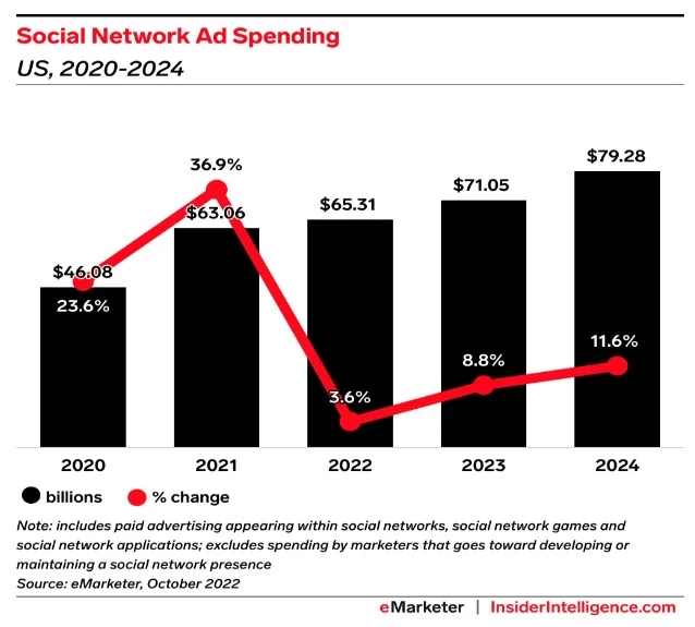 US social ad spend growth is expected to near 9% this year and return to double digits in 2024. (Insider)