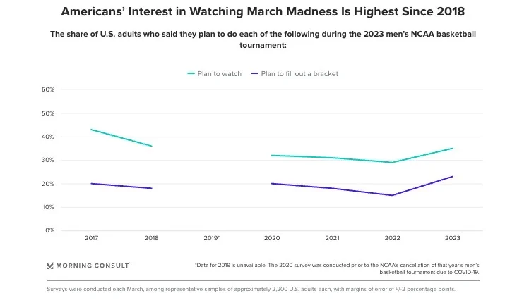 More than 1 in 3 US adults (35%) plan to watch this year’s NCAA men’s tournament, an increase of 6 percentage points from 2022. (Morning Consult)
