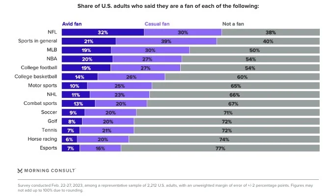 In February, 7% of US adults considered themselves avid fans of esports, lower than the 21% who identified as avid fans of sports in general. (Morning Consult)