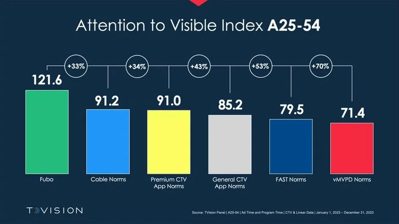 Viewers aged 25-54 are at least 23% more likely to be in the room for Fubo programming than other benchmark categories, including cable and all categories of CTV. (TVT)