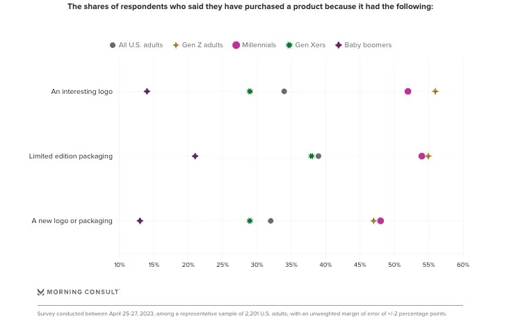 A majority of US Gen Z adults (56%) and millennials (52%) have bought a product because it had an interesting logo while 34% of all US adults have. (Morning Consult)