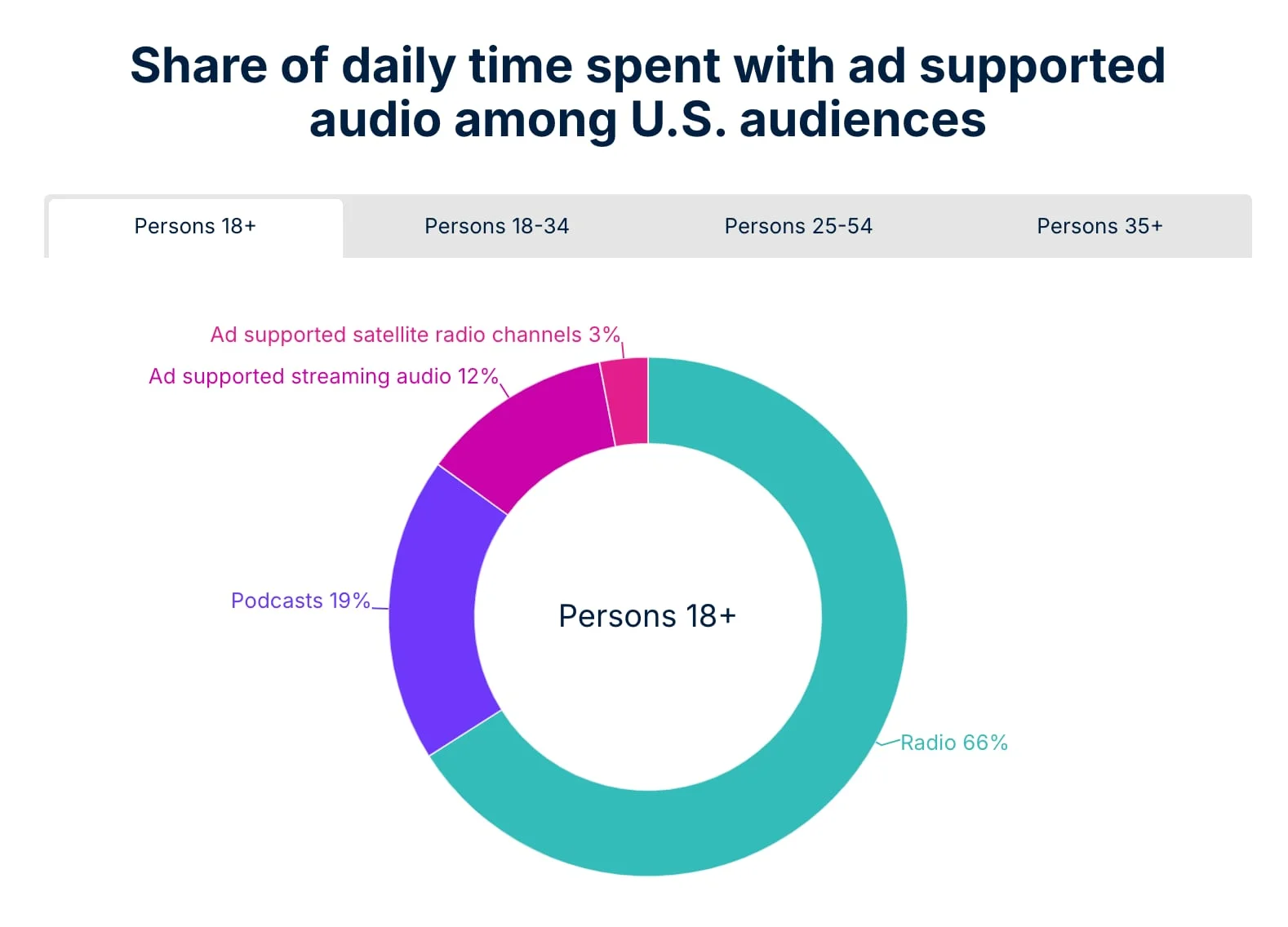 Among U.S. consumers aged 18-34, radio makes up as much as 47% of their daily time spent with ad-supported audio. For people aged 35 and older, that share is even higher, at 73%. (Nielsen)