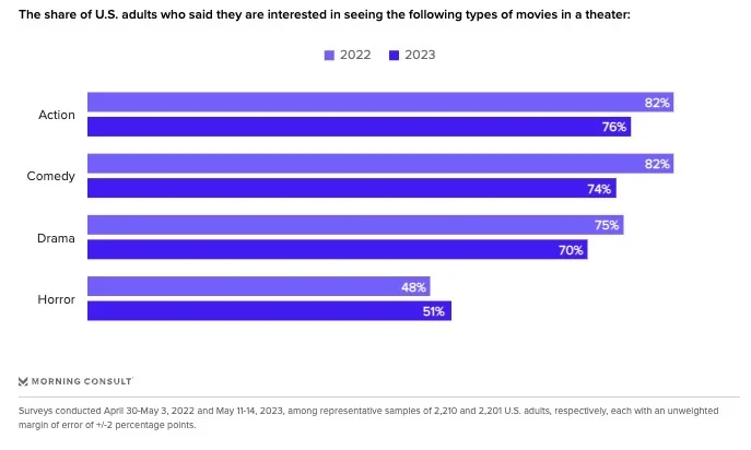 Action (76%) and comedy (74%) are the top genres in terms of Americans' theatrical interest this summer, matching historical trends. (Morning Consult)