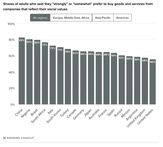The majority of adults globally prefer to buy from brands that reflect their social values. (Morning Consult)