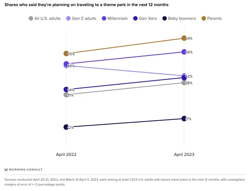 38% of US adults plan on visiting a theme park in the next year, up 7 percentage points YoY. (Morning Consult)